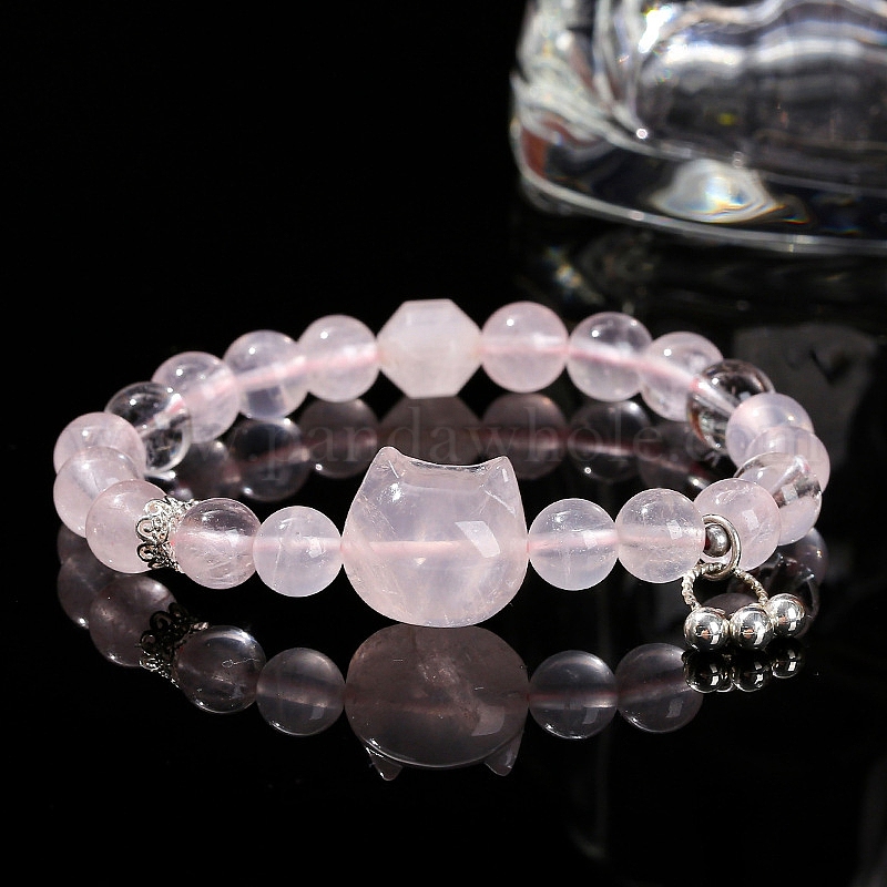 8 Эластичные браслеты из натурального розового кварца с круглой головкой и кошачьей головой для женщин