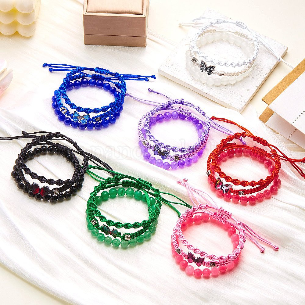 3шт 3 стиль окрашенные драгоценные камни круглые эластичные наборные браслеты, сплав бабочка плетеные бусины регулируемые браслеты