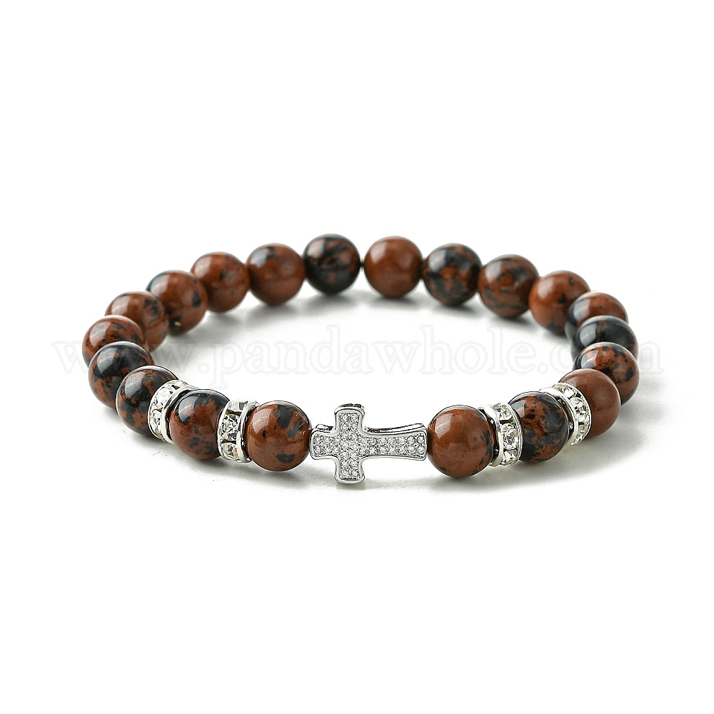Женские эластичные браслеты из латуни с микропаве и прозрачным кубическим цирконием и круглыми эластичными браслетами из натурального красного дерева и обсидиана из бисера