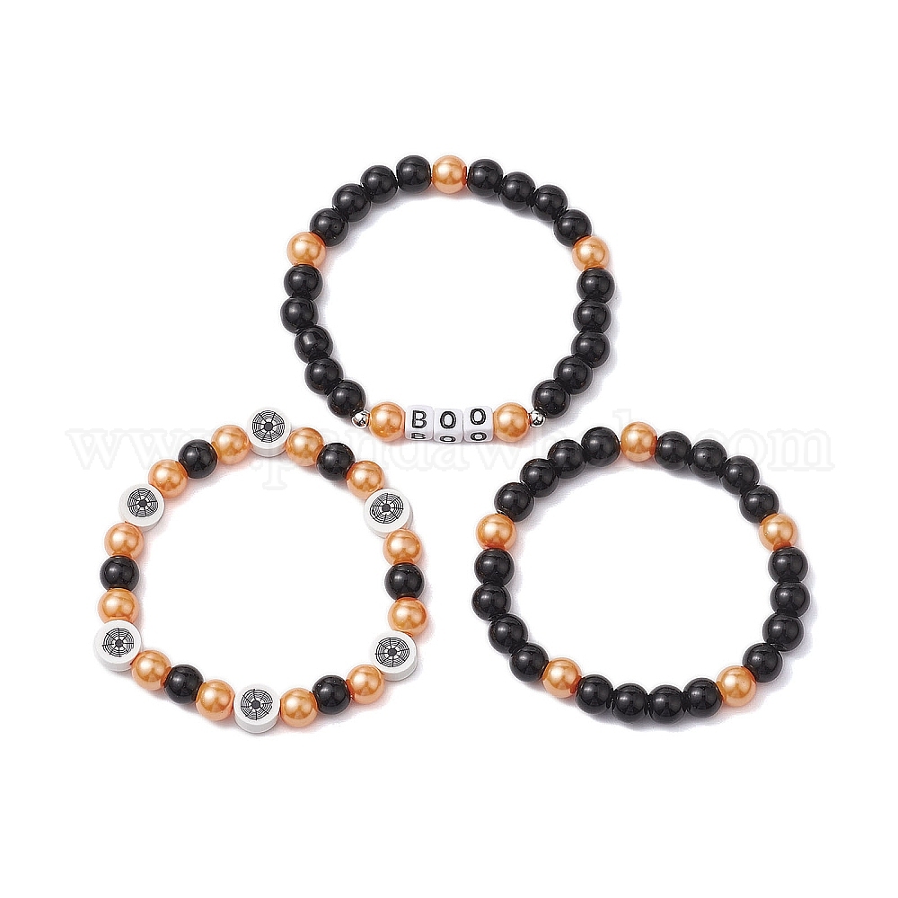 3 шт. 3 стили Хэллоуин тематические 8 наборы эластичных браслетов из круглого стекла и жемчуга мм мм, boo акриловые штабелируемые браслеты