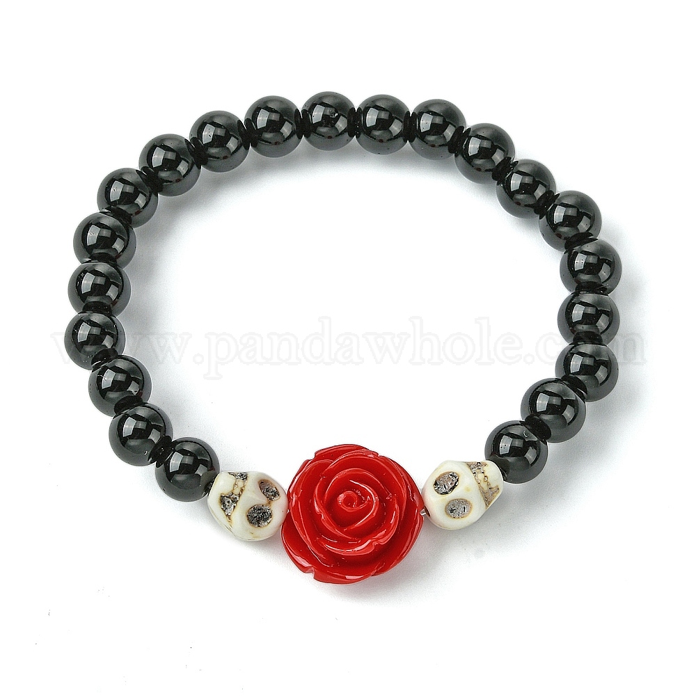 Тема Хэллоуина, эластичные браслеты из синтетического черного камня 8.5 мм, расшитые бисером, Браслеты с черепами из цветов, смолы и окрашенной синтетической бирюзы