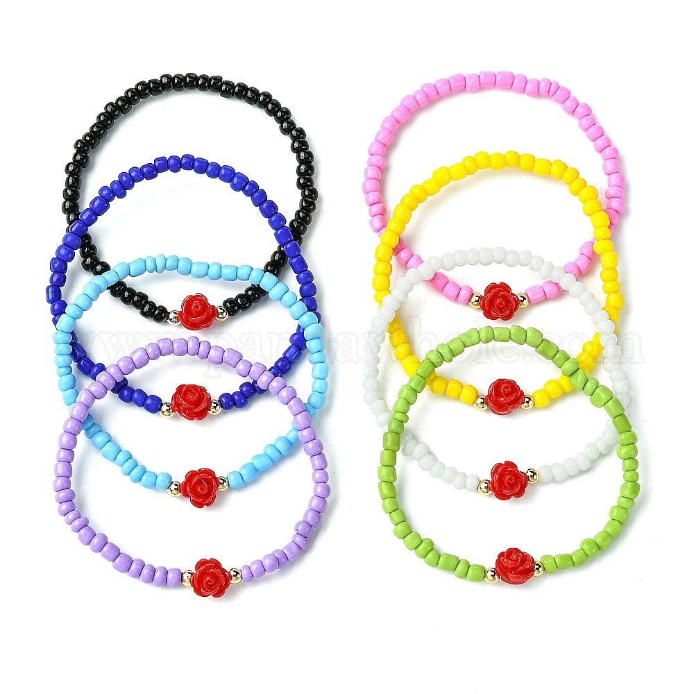 8 шт. 8 цвета, комплекты эластичных браслетов из стеклянного бисера, Штабелируемые браслеты с цветком розы из красной смолы