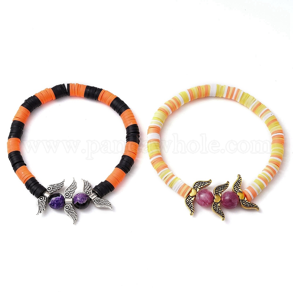 • Смешанные камни 2 шт. 2 стили наборы браслетов на Хэллоуин из окрашенного натурального огненного агата с потрескиванием, кварца и полимерной глины с бусинами, браслеты с крыльями в форме сердца, которые можно складывать, внутренний диаметр: 2-3/8 дюйм (6.1 см), 1 шт / стиль