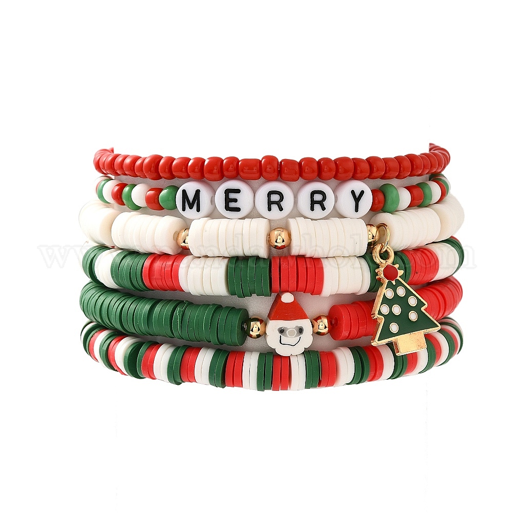 6шт. набор браслетов из полимерной глины heishi и стеклянных бусин с рождественской тематикой, сплав эмали шарм браслеты