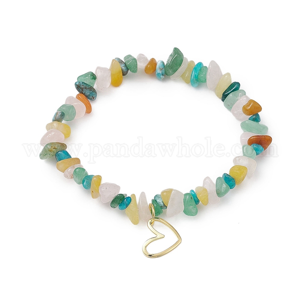 • Смешанные камни Браслеты из бисера и натуральной смешанной каменной крошки, латунные браслеты с сердечками для женщин, внутренний диаметр: 2-1/8 дюйм (5.35 см)