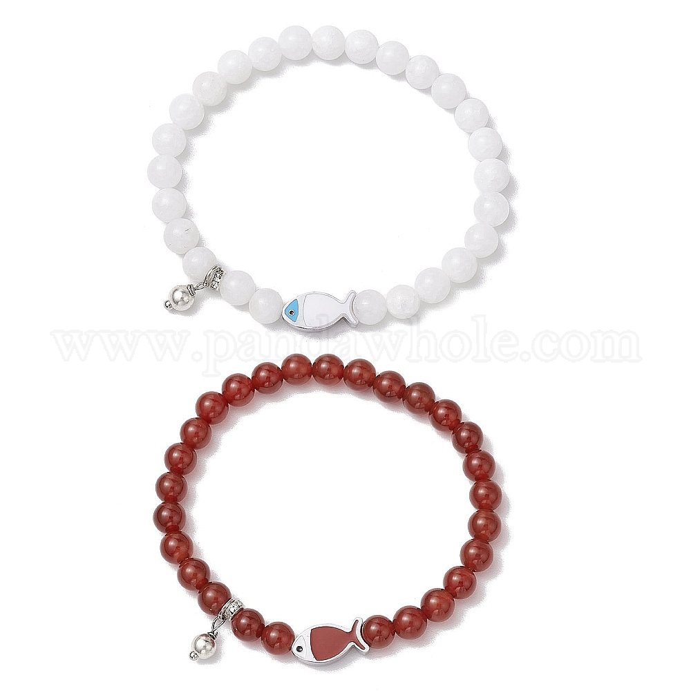 2шт. браслеты из натурального сердолика и натурального белого нефрита с бусинами, 304 Браслеты с подвесками в виде рыбок из нержавеющей стали с эмалью для женщин