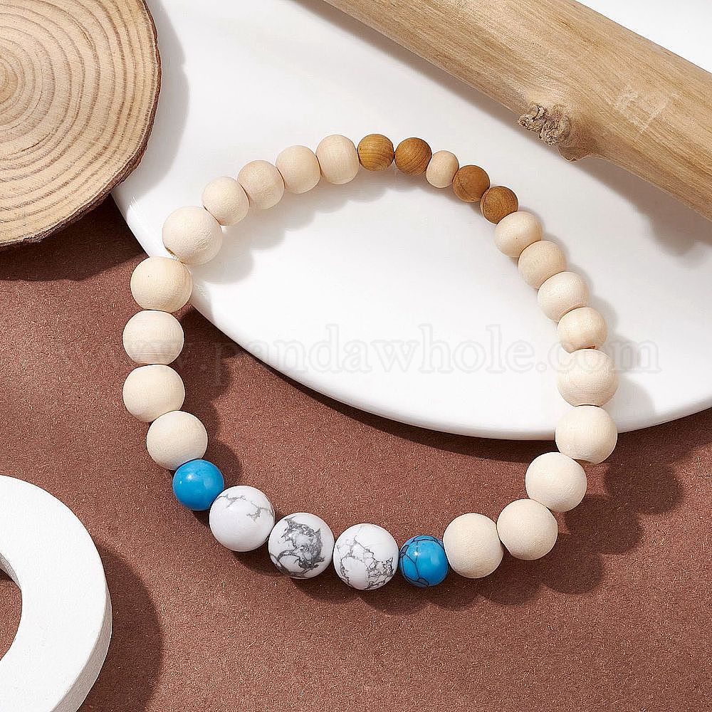 Деревянные бусины растягивающиеся парные браслеты, с натуральным хаулитом и синтетической бирюзой, круглые