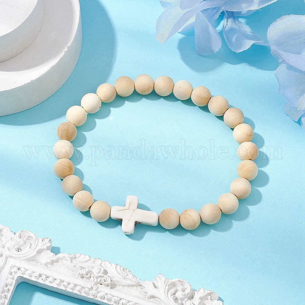 Деревянные биас растягивающиеся браслеты для мем, с синтетическими бирюзовый, крестик