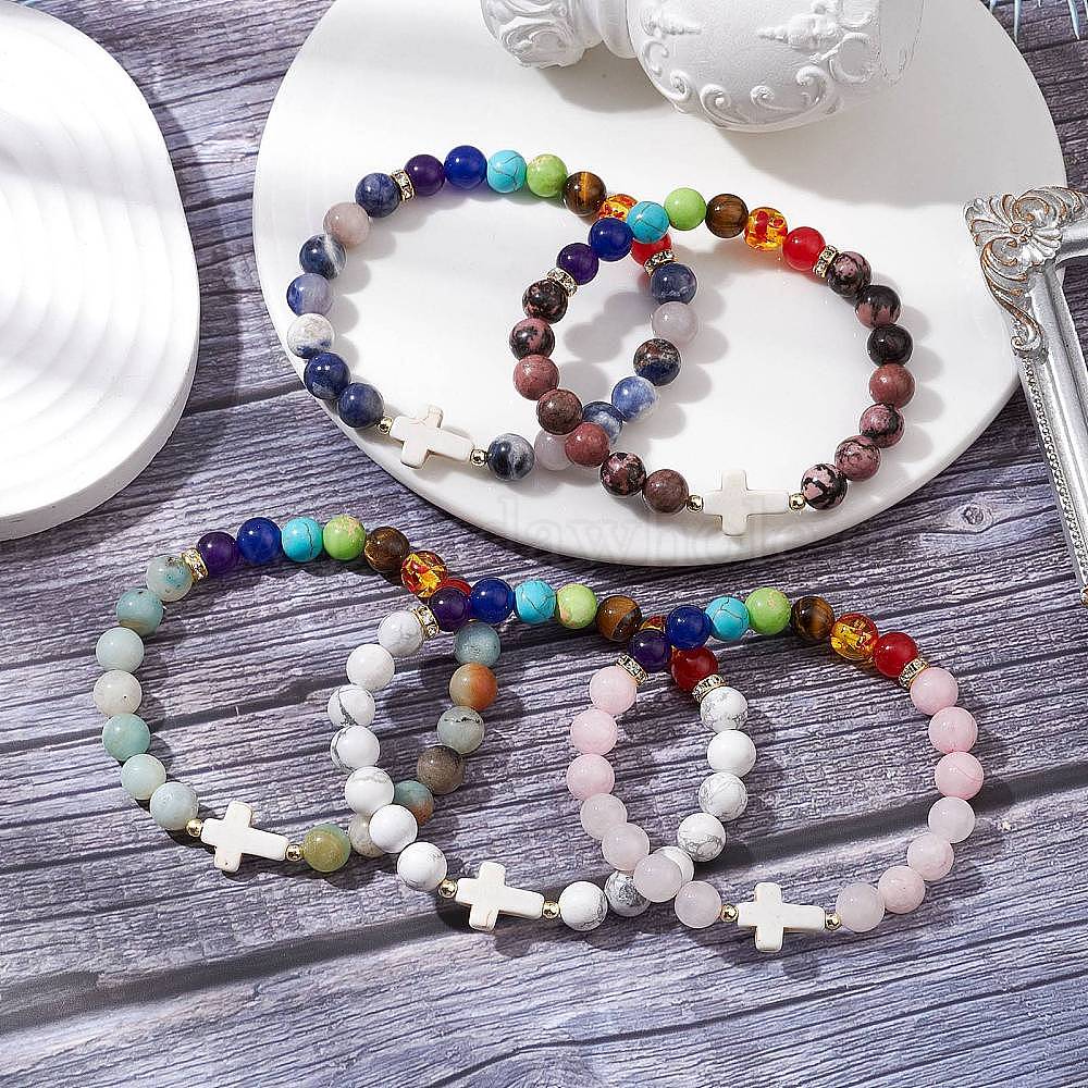 Браслеты с круглыми бусинами и смешанными драгоценными камнями в стиле charka для женщин и мужчин, с имитацией янтаря из смолы и латунными бусинами-разделителями из стразов и гальванизированной немагнитной синтетической бусиной из гематита, крестик