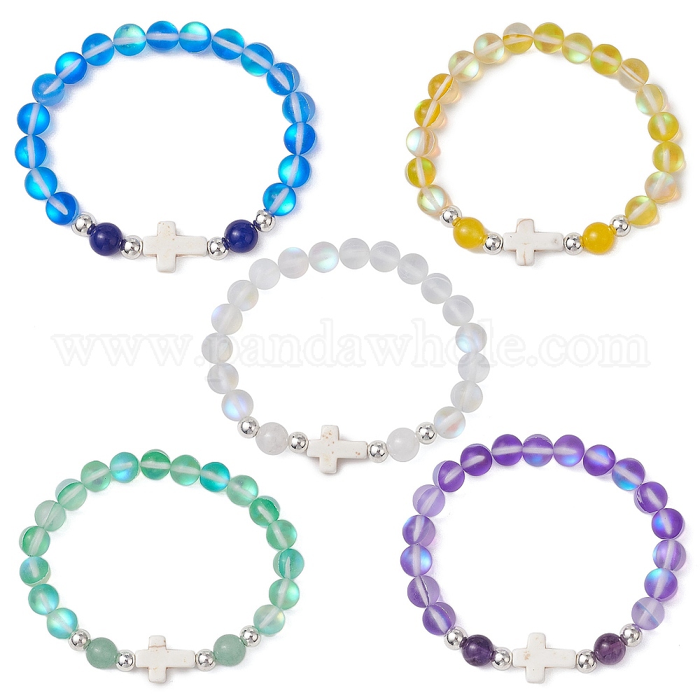 Синтетические лунные камни бусины эластичные браслеты для женщин и мужчин, с синтетическими бирюзовыми крестиками