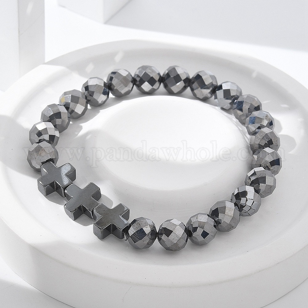Натуральный титановый герц бусины эластичные браслеты для женщин и мужчин, с немагнитным гематитовым крестиком-талисманом, граненые