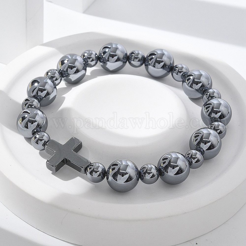 Натуральный титановый герц бусины эластичные браслеты для женщин и мужчин, с немагнитным гематитовым крестиком-талисманом