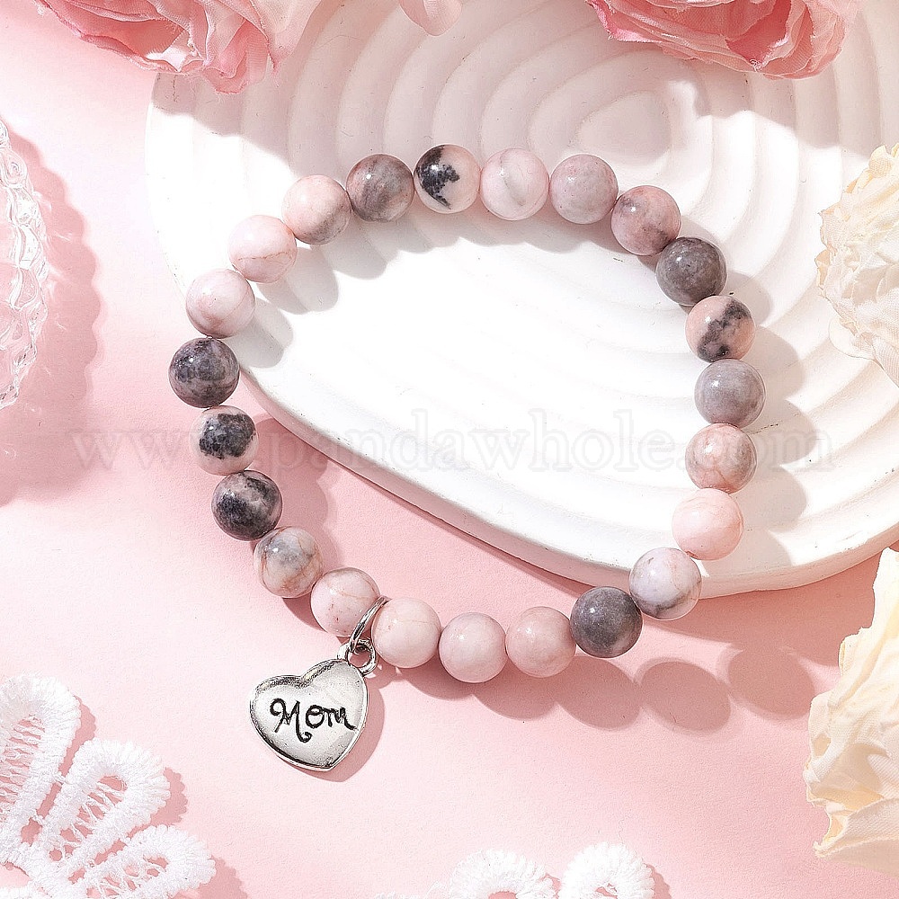 Тема дня матери натуральные розовые зебровые яшмовые бусины эластичные браслеты для женщин, с подвесками из сплава в форме сердца в тибетском стиле, со словом мама