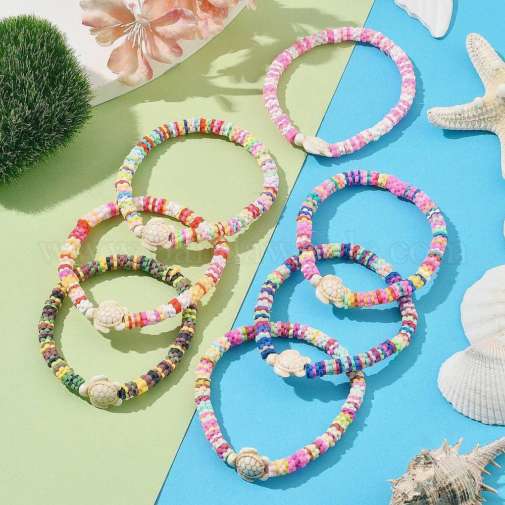 • (52) Непрозрачная лаванда 7шт 7 цвета ручной работы из полимерной глины сливового цвета и синтетических бирюзовых бусин, эластичные браслеты для женщин, Морская черепаха, разноцветные, 1/4 дюйм (0.55 см), внутренний диаметр: 3-1/2 дюйм (9 см)