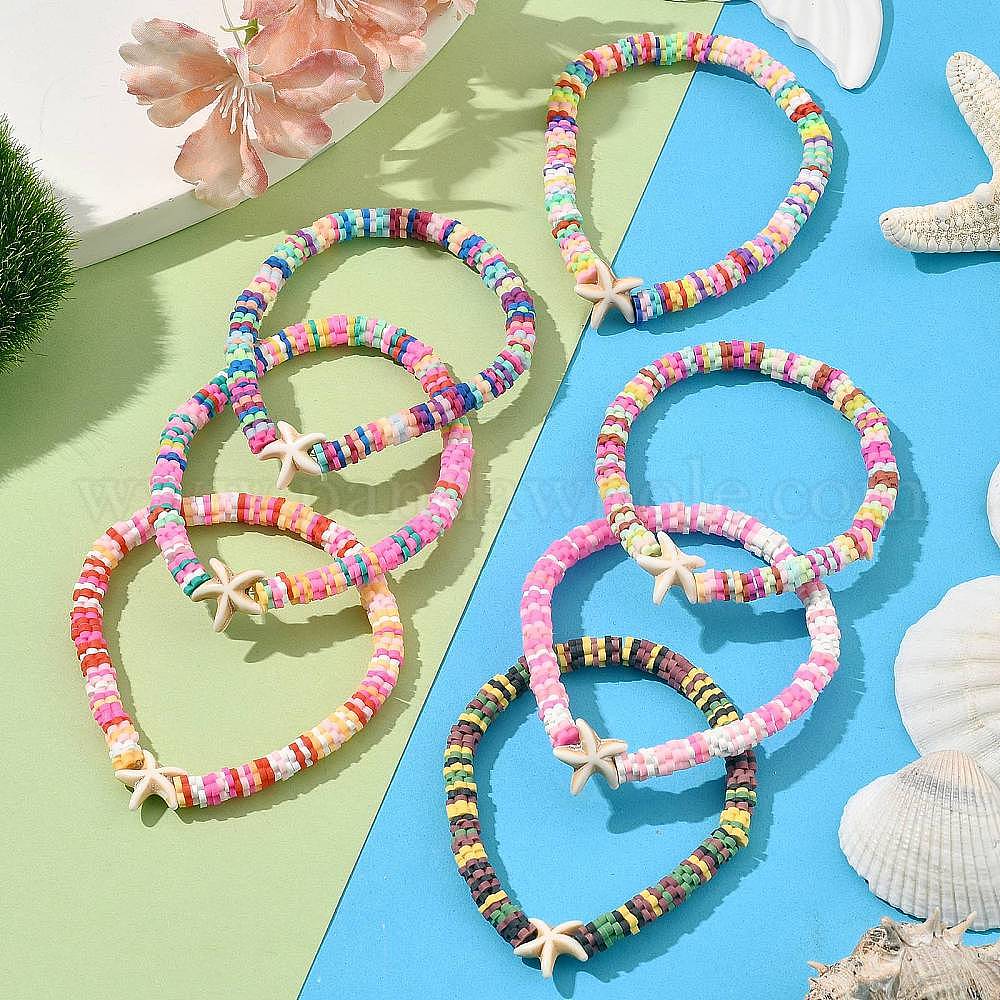 7шт 7 цвета ручной работы из полимерной глины сливового цвета и синтетических бирюзовых бусин, эластичные браслеты для женщин, морская звезда