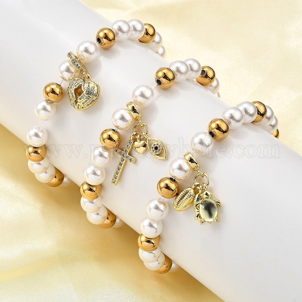 Латунь браслеты простирания, с латунными подвесками из микропаве из прозрачного кубического циркония и пластиковыми бусинами с имитацией жемчуга и ионным покрытием (IP) 304 бусины из нержавеющей стали, стойки покрытие, золотые