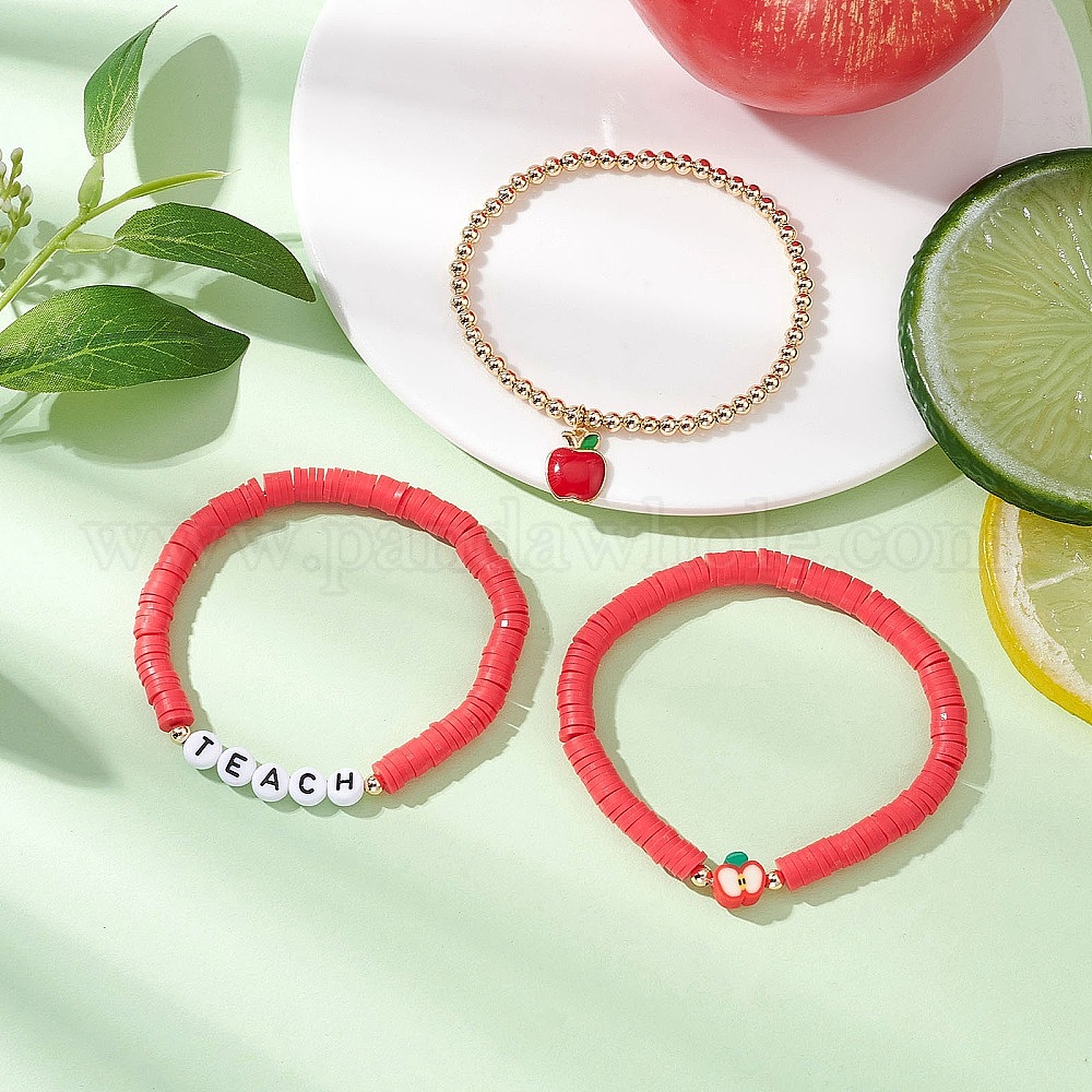 3 шт. 3 стили браслет из полимерной глины с бусинами на день учителя и браслет с подвесками в виде яблока из сплава и эмали для женщин, с корейской эластичной хрустальной нитью и акриловыми бусинами
