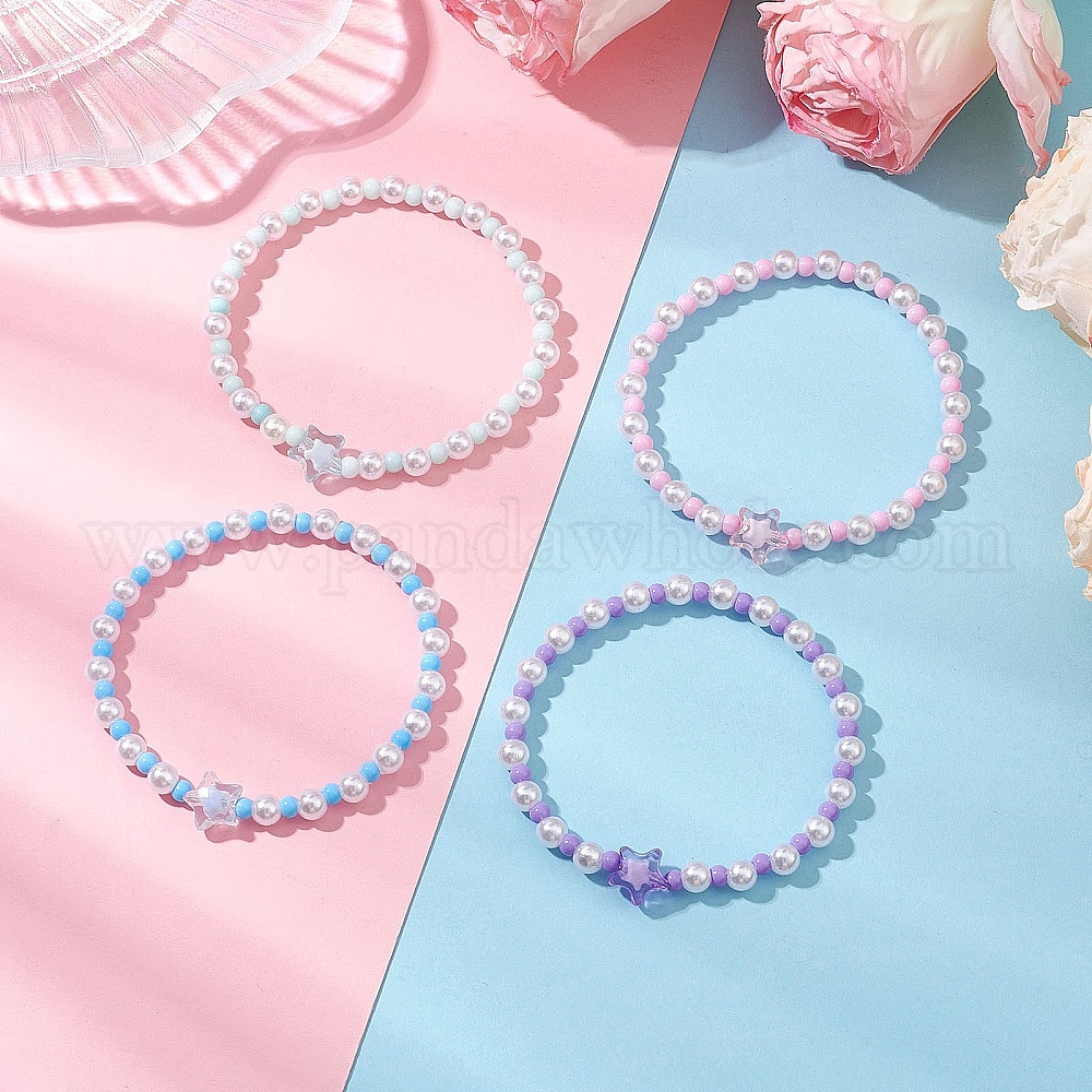 4шт. АБС-пластик, имитация жемчуга, круглые бусины, эластичные браслеты для женщин, с акриловой звездочкой и стеклянными бусинами