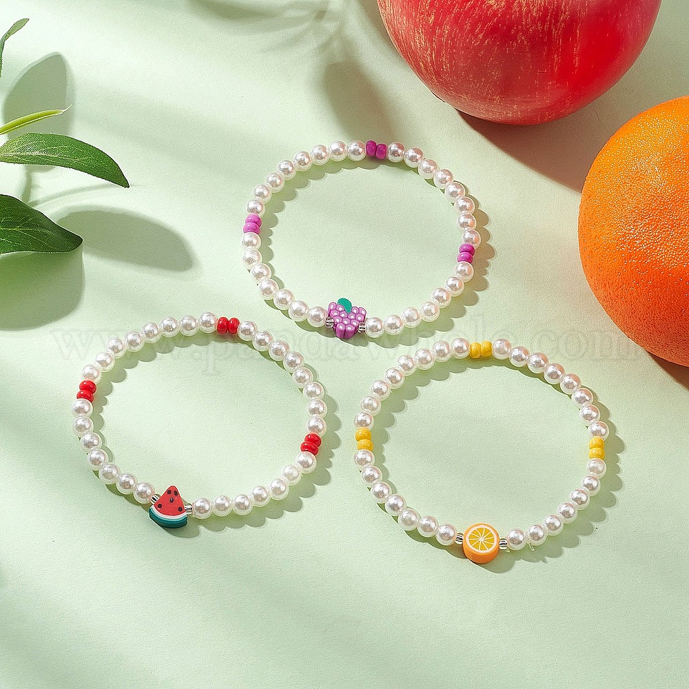 3шт. Летние фруктовые браслеты из АБС-пластика с имитацией круглых жемчужин и бусинами для женщин, с бусиной из полимерной глины ручной работы, арбуз, виноград и апельсин