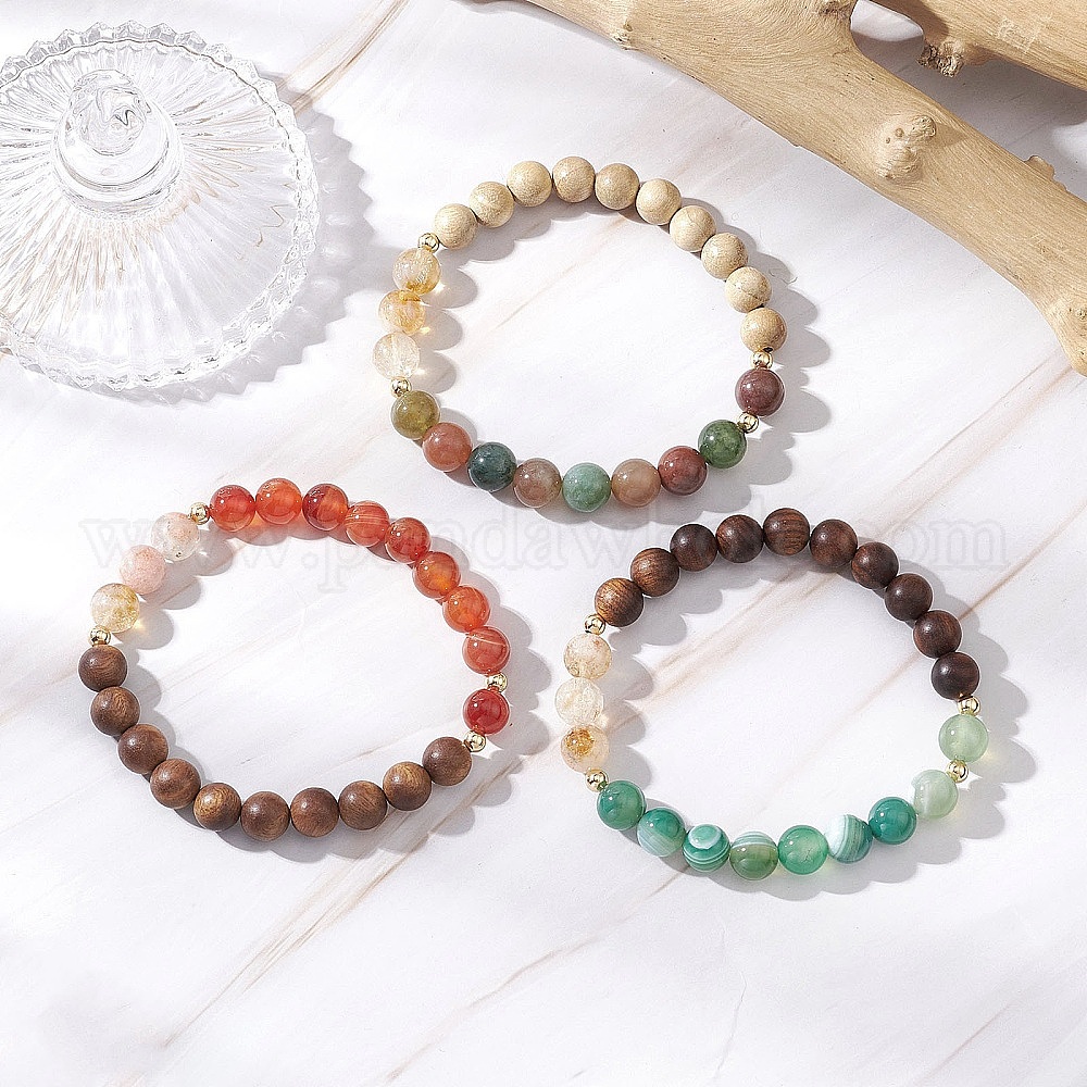 Женские браслеты из натурального дерева и круглых бусин с драгоценными камнями