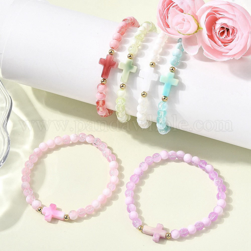 6шт. 6 цвета треснувший стеклянный круглый бисер тянущиеся браслеты, крест акриловые украшения для мужчин и женщин