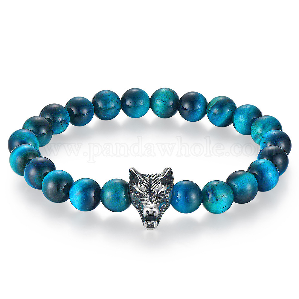 • Тигровый глаз Браслеты из круглых бусин из натурального окрашенного синего тигрового глаза, ювелирные изделия из нержавеющей стали для мужчин, волк