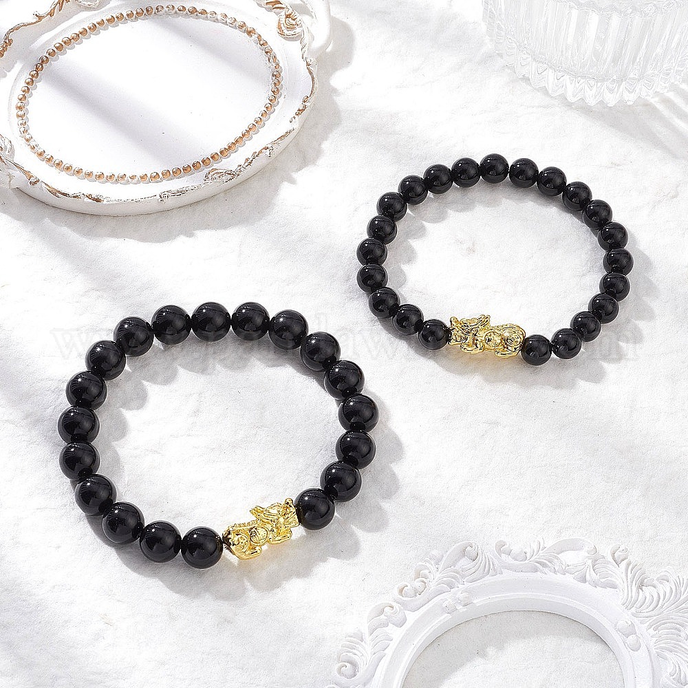 • Обсидиан Комплекты эластичных браслетов из натурального обсидиана, Pi Xiu, с бусинами сплава, внутренний диаметр: 2-3/8 дюйм (6 см)