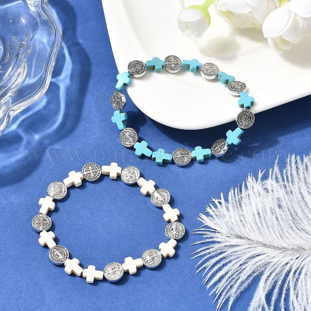 Браслеты из синтетической окрашенной бирюзы и сплава с плоскими круглыми бусинами для мужчин и женщин, крестик