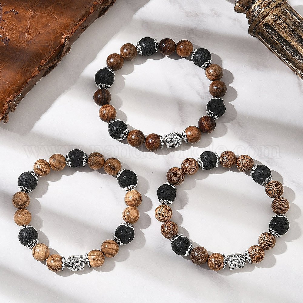 Браслеты из круглых бусин из натурального дерева и вулканического камня, браслеты из сплава с бусинами в виде головы Будды для мужчин и женщин