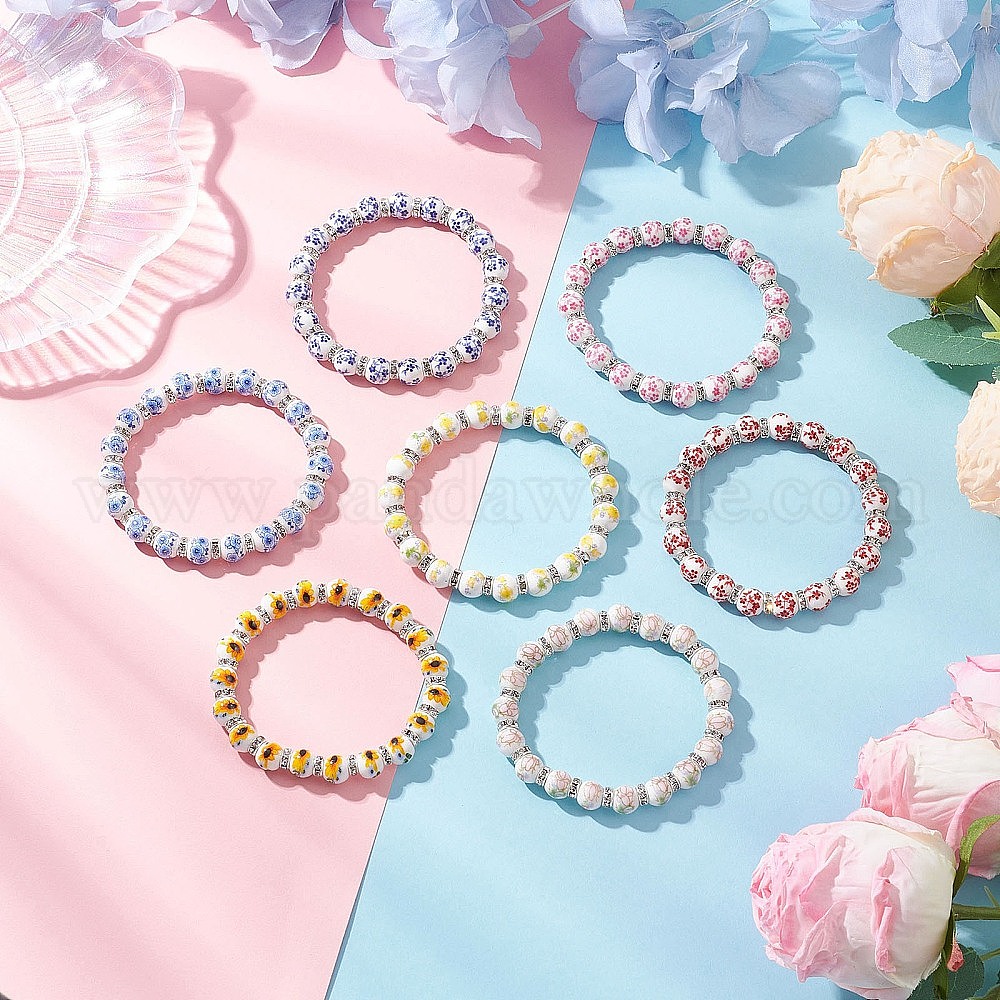 Эластичные браслеты из фарфоровых керамических бусин с цветочным принтом для женщин, круглые, с латунными бусины со стразами