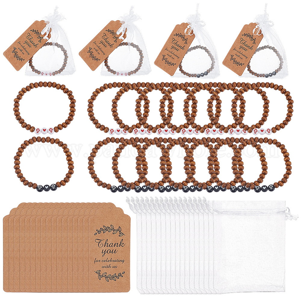 24 шт. круглых эластичных браслетов из натурального дерева с бусинами, с 24шт. подарочные бирки из крафт-бумаги, 24 подарочные пакеты из органзы