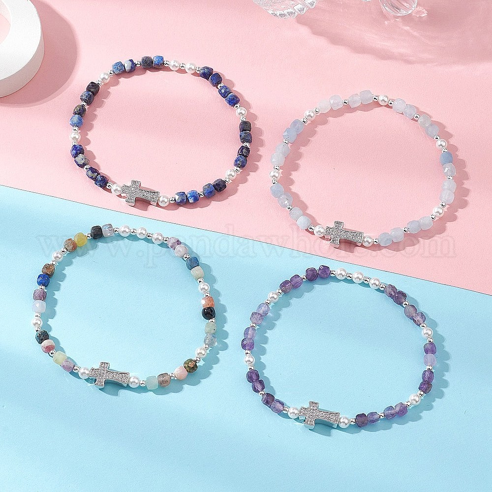 Природных драгоценных камней из бисера браслеты простирания, Женские украшения с микропаве из латуни и кубическими циркониями, куб и крест