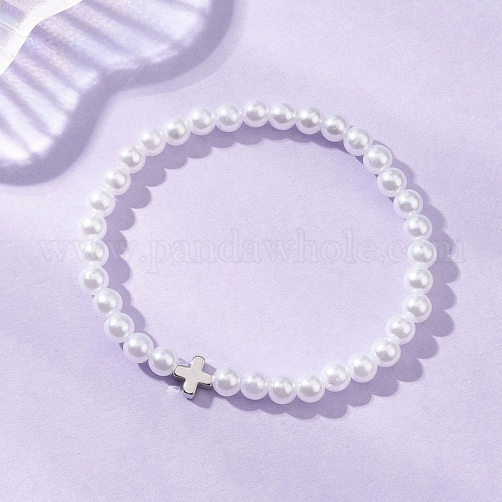 • Белый АБС-пластик имитация жемчужных бусин эластичные браслеты, украшения из латуни для женщин, круглый и крест, платина, белые, бусины : 6 мм, внутренний диаметр: 2.24 дюйм (5.7 см)