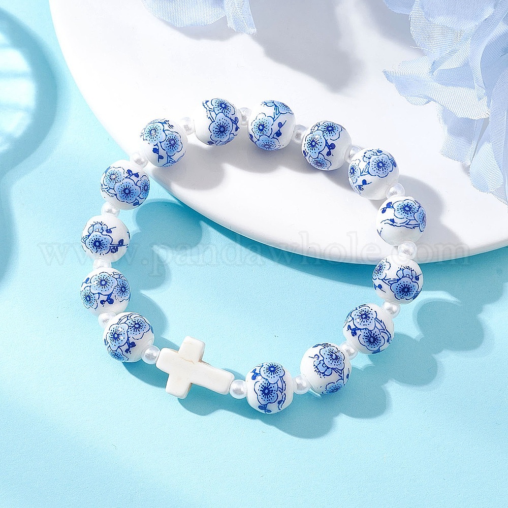Браслеты из акрила с имитацией жемчуга, фарфора ручной работы и синтетических бирюзовых бусин., эластичные браслеты для женщин, круглый и крест