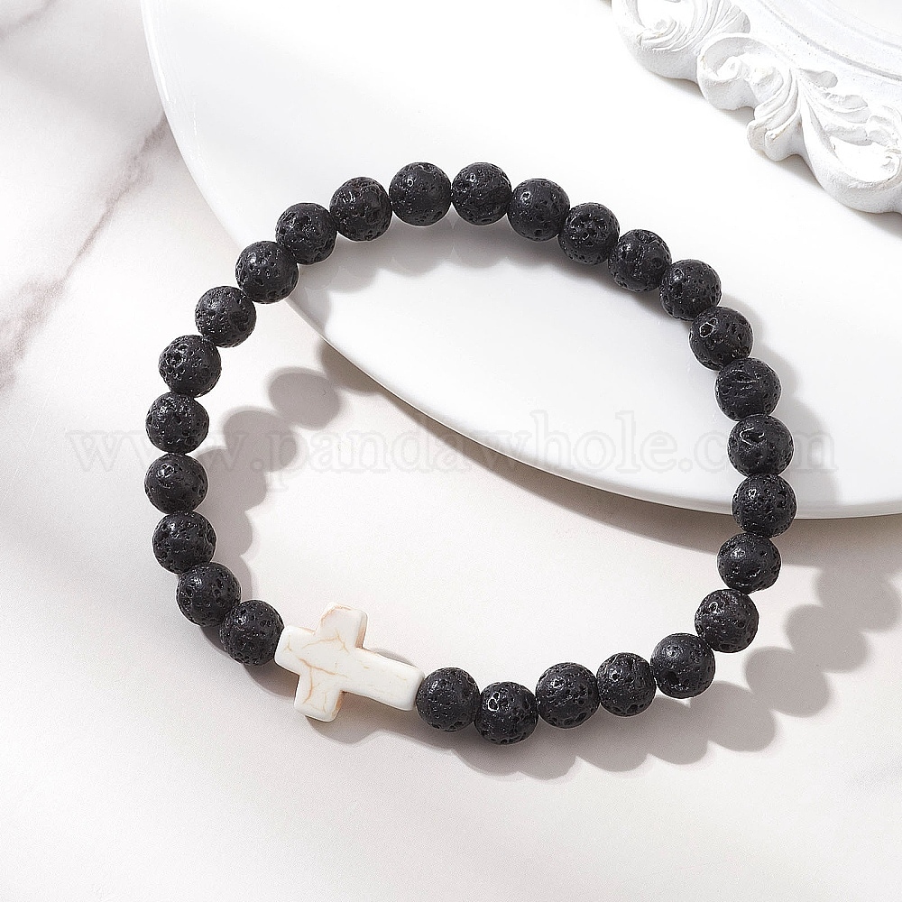 Эластичные браслеты из натуральных бусин из лавы для женщин, с синтетическим бирюзовым крестом