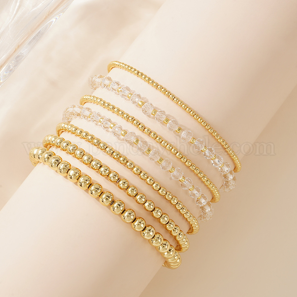 • Золотой Латунные браслеты из эластичных бусин для женщин, круглые, золотые, 6.89 дюйм (17.5 см)