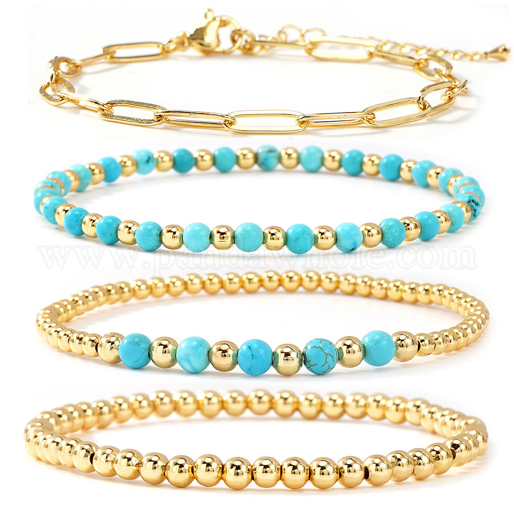 4 шт. наборы браслетов в богемном стиле, Круглые эластичные браслеты из латуни и синтетических бирюзовых бусин., латунные браслеты скрепки