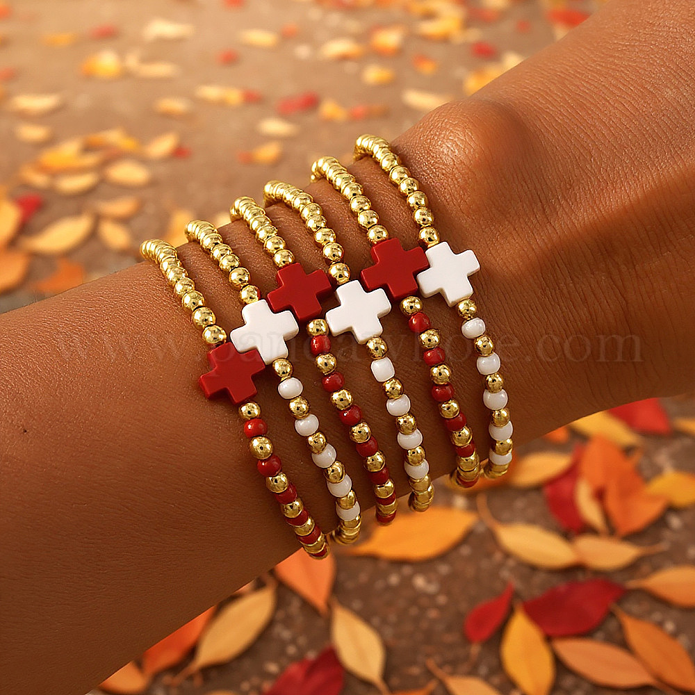 6шт. латунные круглые бусины, эластичные браслеты, Браслеты с подвесками в виде стеклянных крестиков для женщин