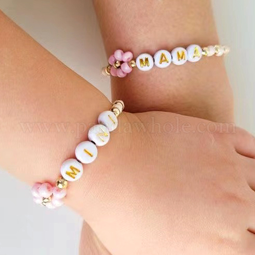 • Латунь 4 Набор эластичных браслетов из латуни и круглых стеклянных бусин ко Дню матери, акриловые подвески для женщин, мама и малыш, регулируемый