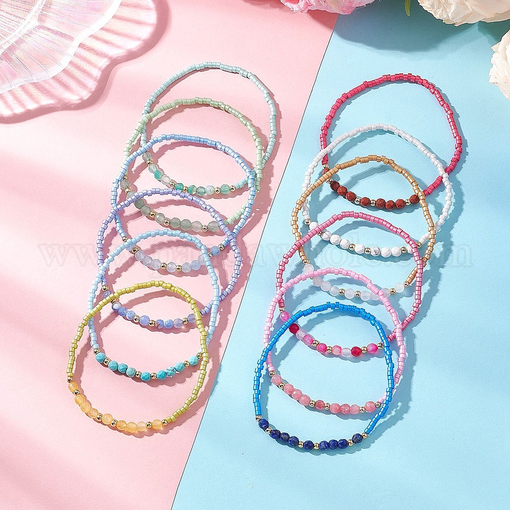 Браслеты из стеклянного бисера и натуральных драгоценных камней для женщин, круглые, с латунной бисера (03ACG7)