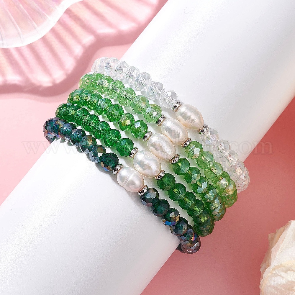 5 Браслеты из стекла и натурального культивированного пресноводного жемчуга, эластичные, для женщин, рондель