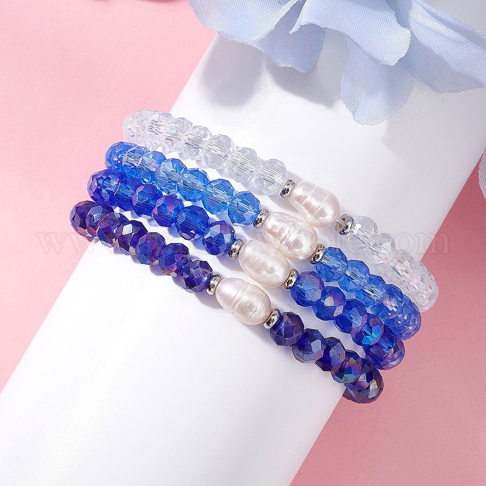4 Браслеты из стекла и натурального культивированного пресноводного жемчуга, эластичные, для женщин, рондель