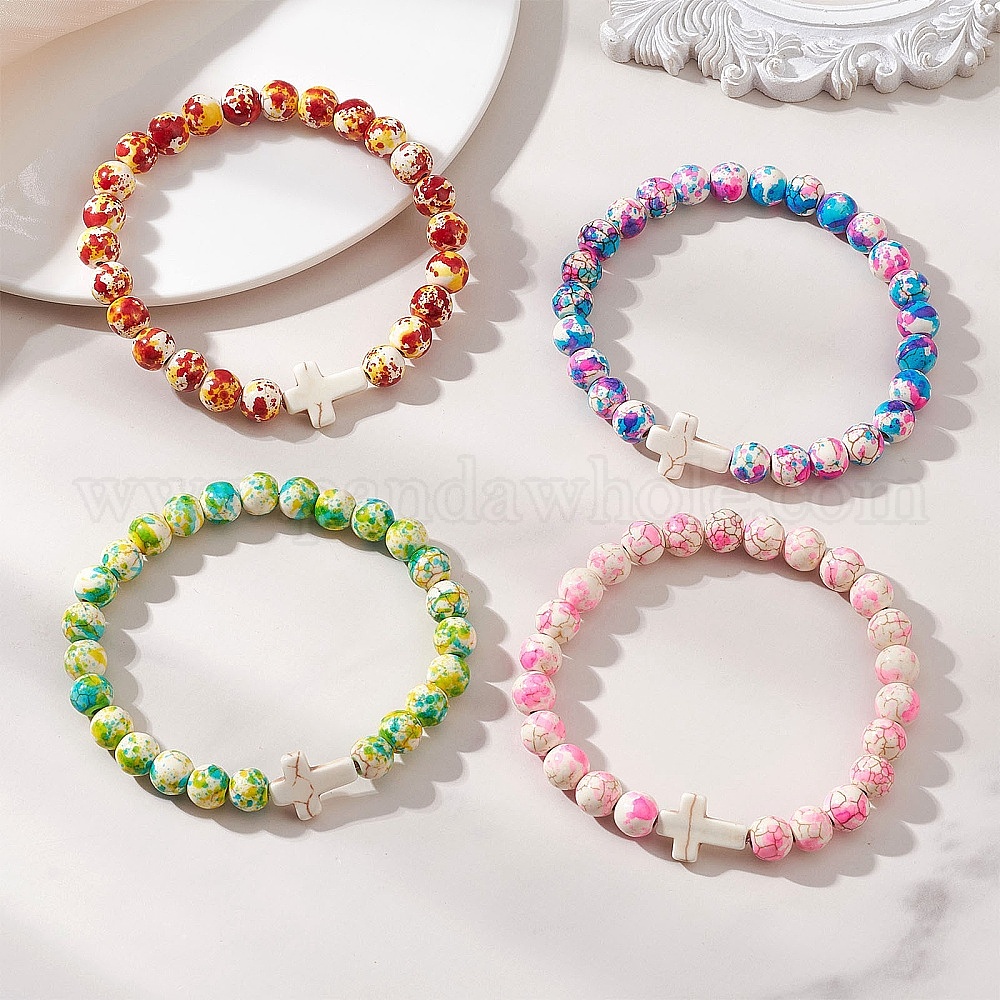 Окрашенные синтетические бирюзовые бусины эластичные браслеты для женщин и мужчин, круглый и крест