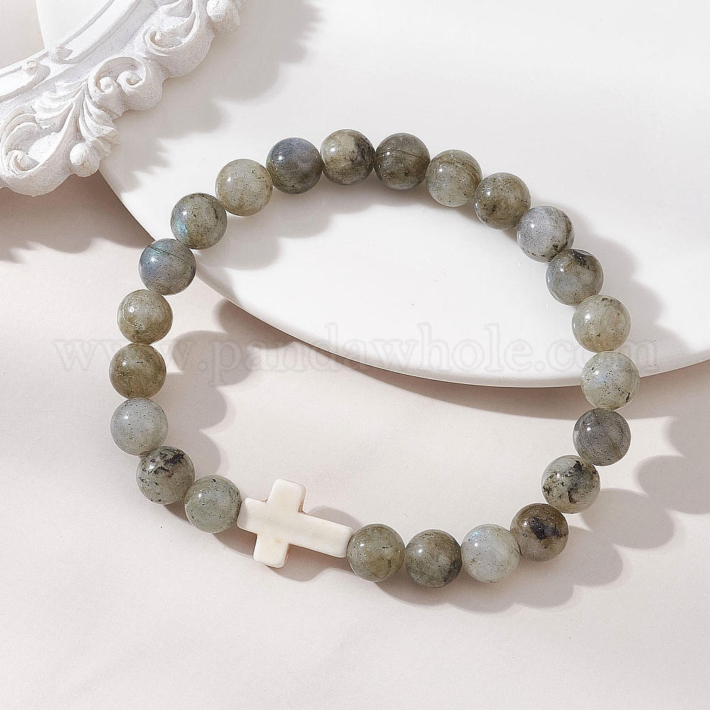 Браслеты из натурального лабрадорита и синтетической бирюзы., эластичные браслеты для женщин и мужчин, круглый и крест (03ASQE)