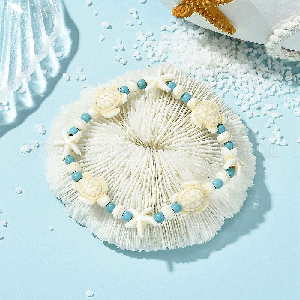 • Белый Женские эластичные браслеты из синтетических бирюзовых бусин, черепаха и морская звезда, белые, внутренний диаметр: 1.77~1.97 дюйм (4.5~5 см)
