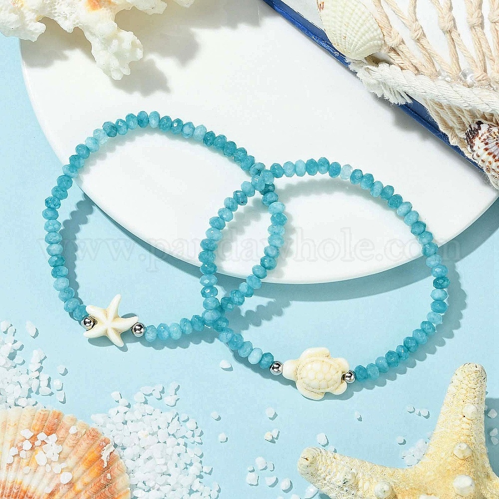 2шт. 2 стили синтетических бирюзовых и окрашенных натуральных нефритовых бусин-ронделей из Малайзии эластичные браслеты для женщин, черепаха и морская звезда