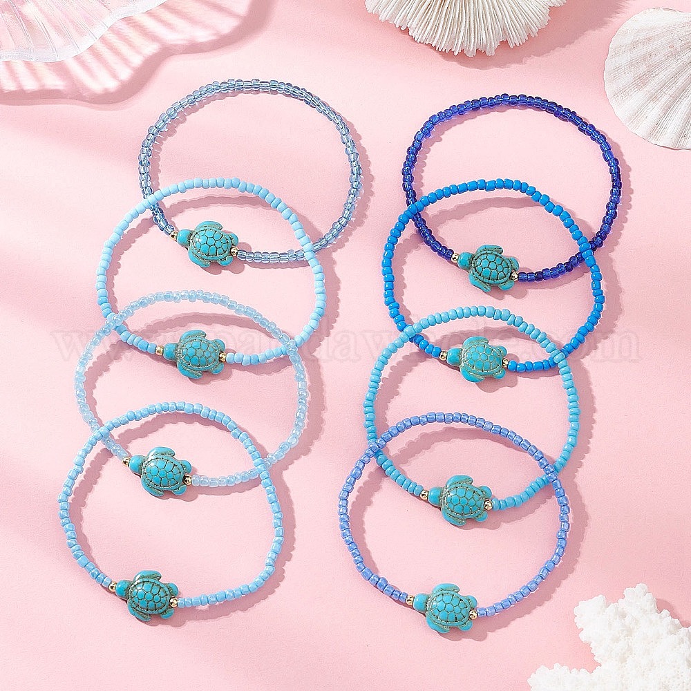8 Набор эластичных браслетов из стеклянного бисера и синтетического бирюзового бисера в форме черепахи для женщин
