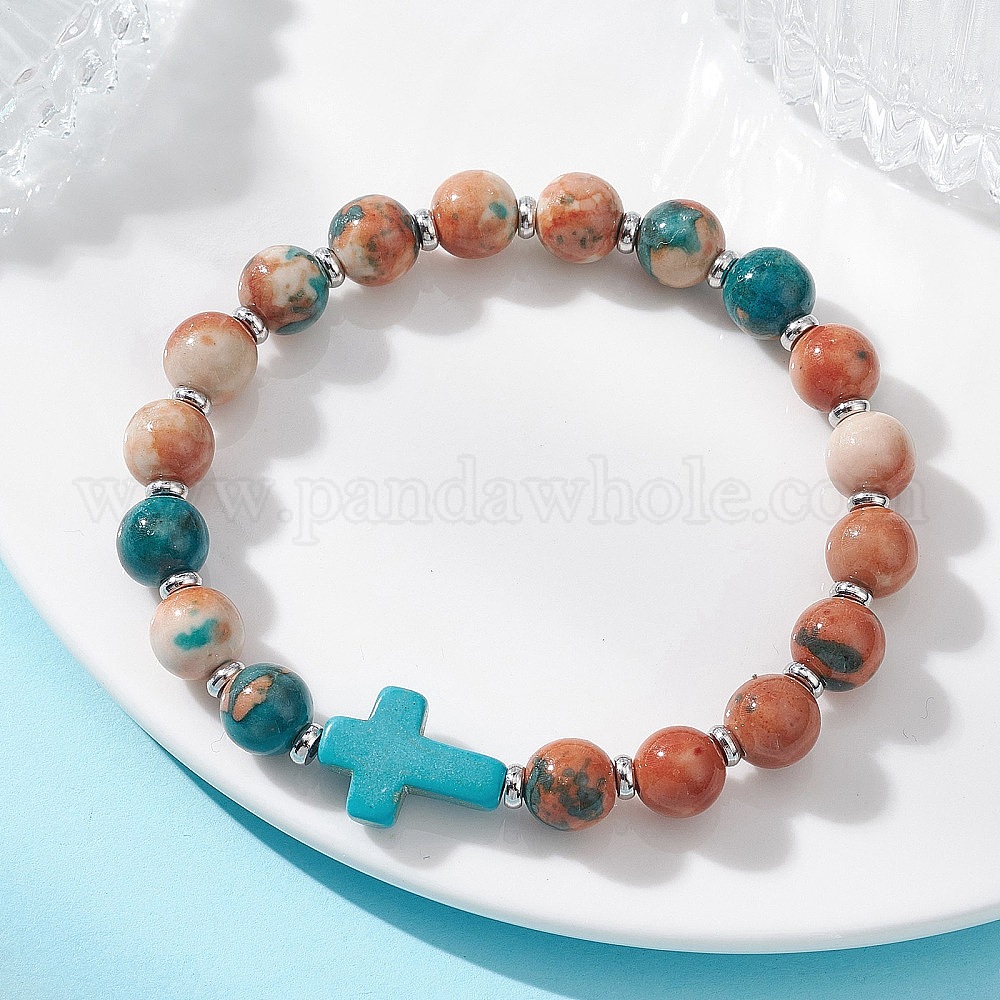 Браслеты из окрашенных и термически обработанных синтетических бусин из окаменелого камня и окрашенной бирюзы, эластичные, для женщин и мужчин., круглый и крест