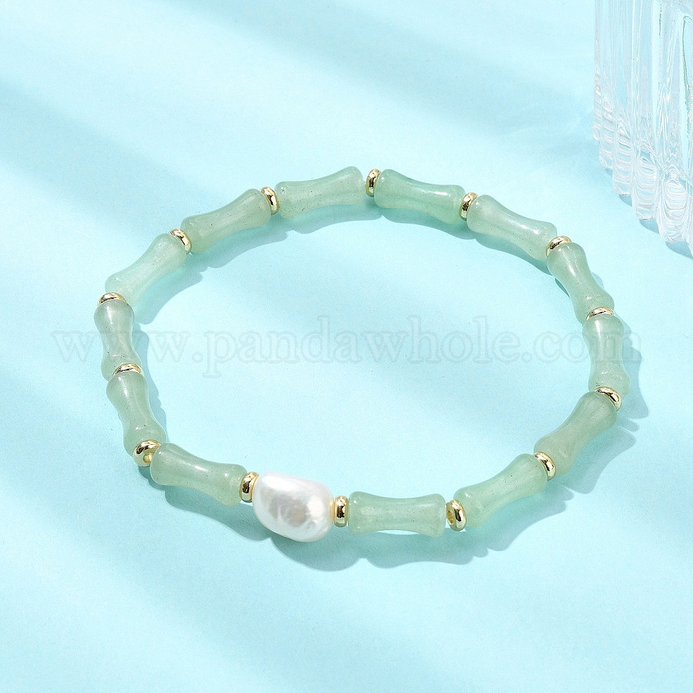 Натуральные бамбуковые браслеты из бусин зеленого авантюрина, эластичные, для женщин., с натуральным культивированным пресноводным жемчугом и плоскими латунными разделительными бусинами., реальный 14 k позолоченный