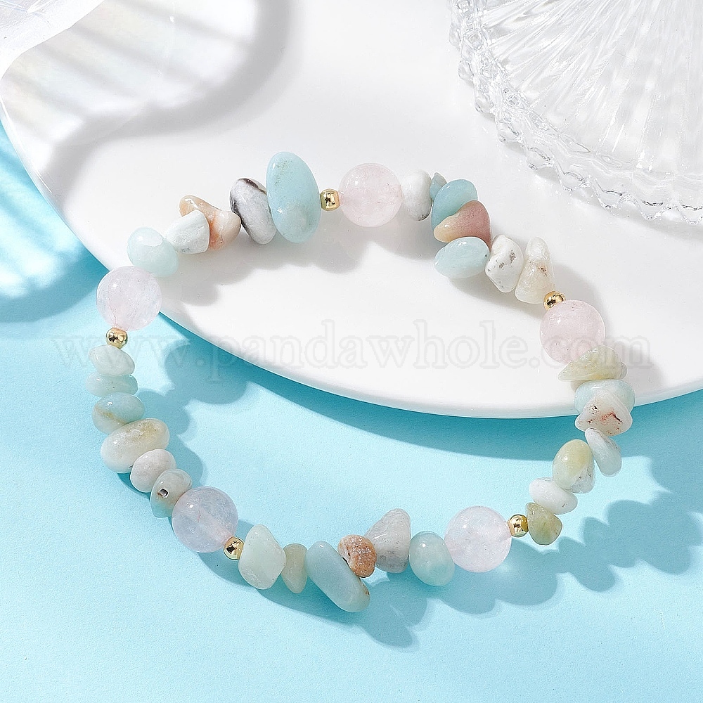 Круглые браслеты из натурального розового кварца, цветочных амазонитовых крошек и латунных бусин для женщин., реальный 18 k позолоченный